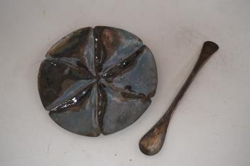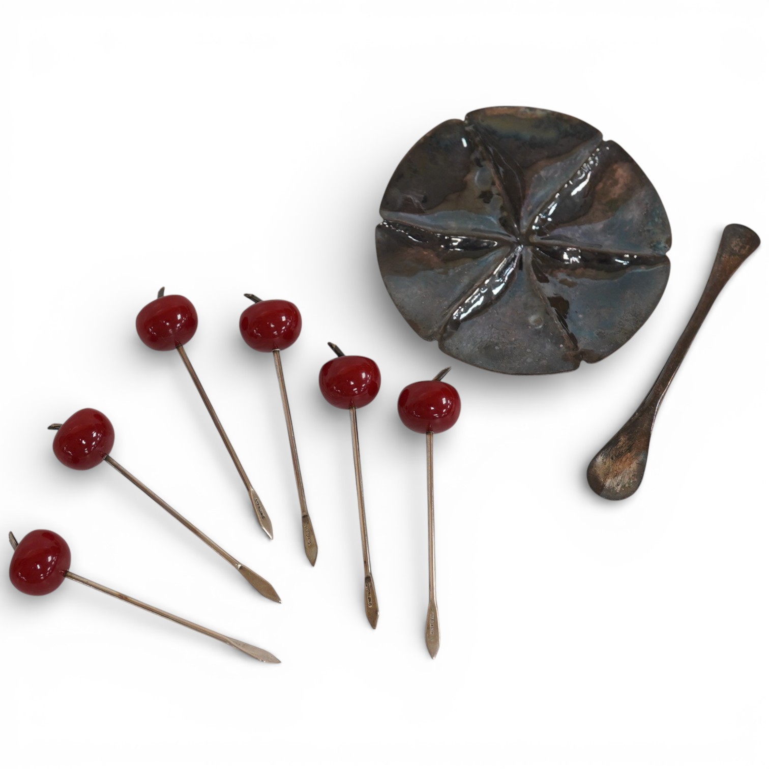 A set of six modern sterling cocktail sticks, with 'cherry' terminals, stamped sterling, 69mm, together with an Elizabeth II silver petal dish and spoon, maker CJG, London, 1981.