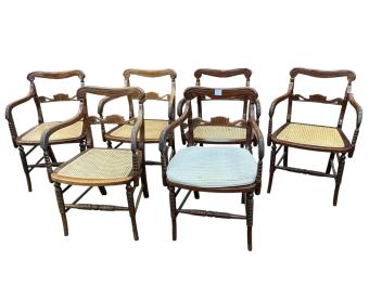 Lot 1092 , A set of six reproduction Regency style mahogany elbow chairs, the dipped crest rails over scrolled spars and caned seats with squab cushions on turned underframes, width 54cm, depth 48cm, height 79cm