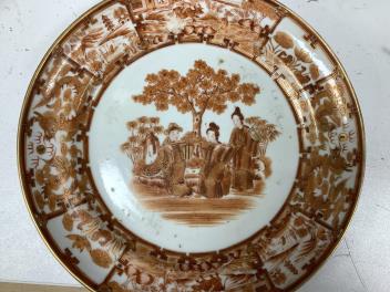 One plate rim chipped, approx. 8x2mm; three further smaller rim-chips, images 4 and 5. One plate with small, shallow rim-chip, image 6. Other plate good. All with some surface wear and wear to gilding. No hairline cracks.