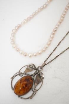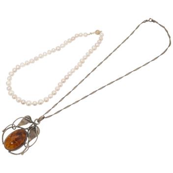 Lot 1154 , A silver and amber necklace, early 20th century and later, pendant length 6cm, later chain 44cm; and a cultured pearl necklace with a silver clasp, length 33cm; together with an early 20th century case stamped Collingwoo