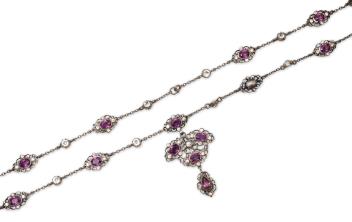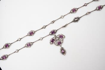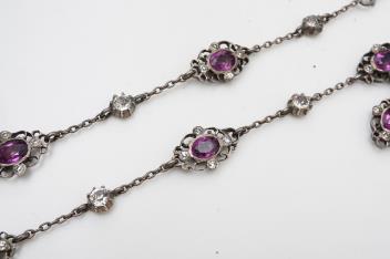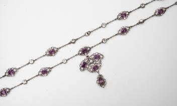 A silver and paste necklace, early 20th century, designed in the Renaissance style, with foliate scroll motifs set with violet and colourless pastes, connected by chain linking, length 70cm, pendant length 6cm, stamped 900