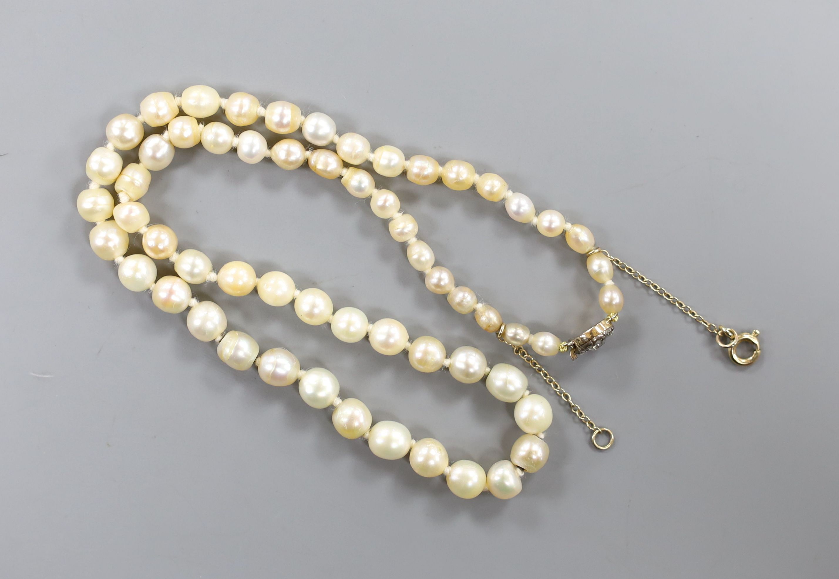 A single strand graduated cultured pearl necklace, with diamond set yellow metal clasp, 38cm.