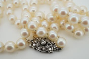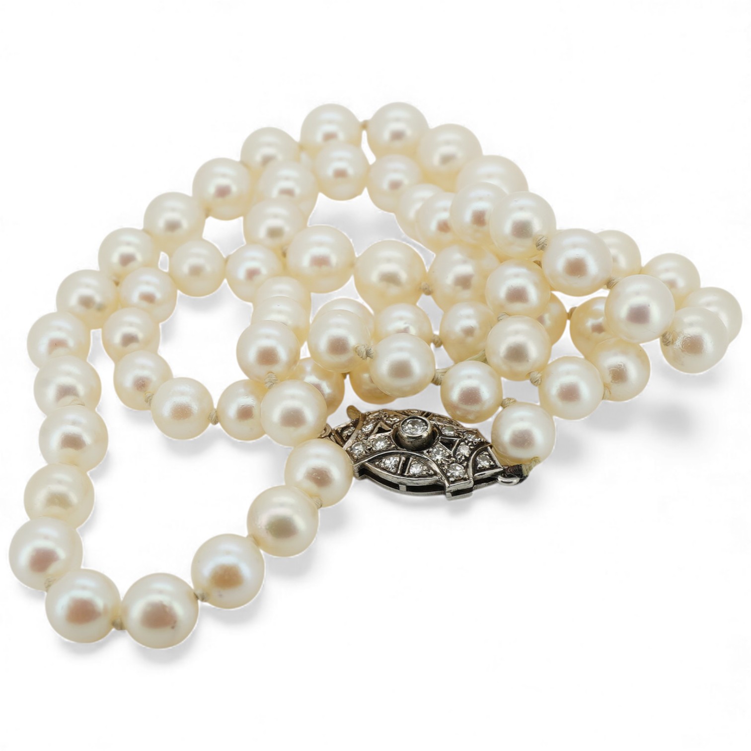 Lot 934 , A single strand graduated cultured pearl necklace with diamond cluster set white metal navette shaped clasp, (string a.f.), 50cm, largest pearl diameter approx. 8.9mm.
