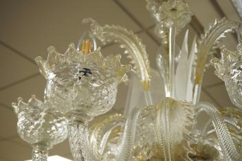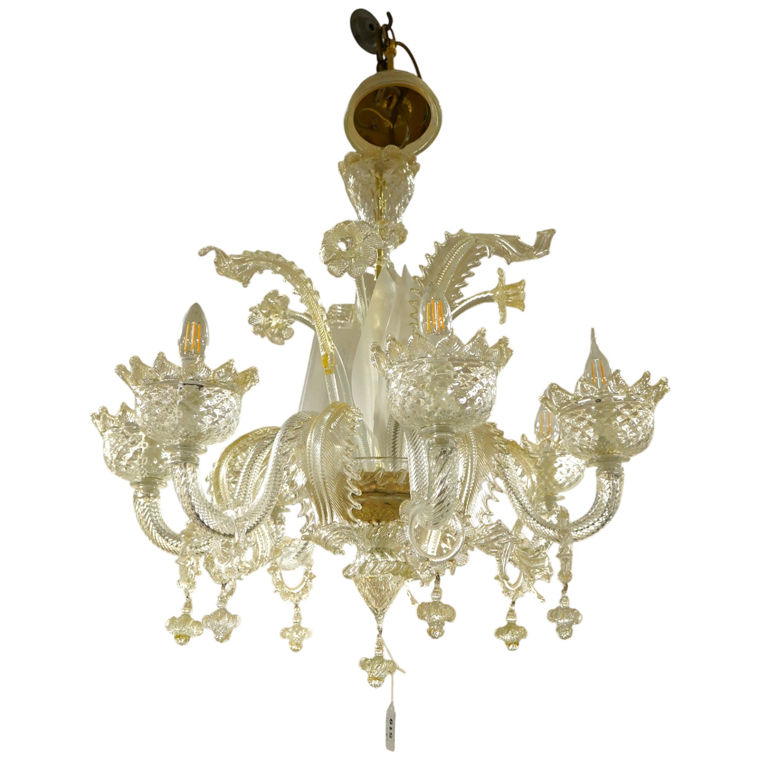 Lot 519 , A six branch Murano glass chandelier with decorative glass leaves, flower stems and hanging circular pendants - 68cm long