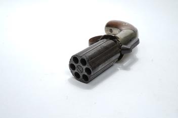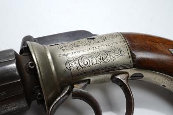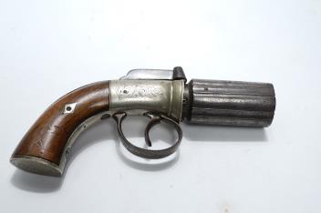 Lot 1252 , A six shot 120 bore self-cocking percussion pepperbox revolver with fluted barrels, Birmingham proof, rounded foliate engraved frame with ‘Improved Revolver’, and two-piece walnut grips