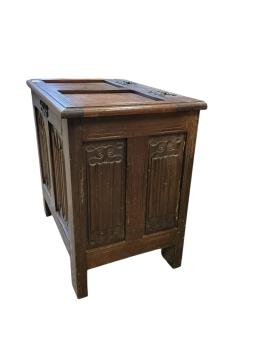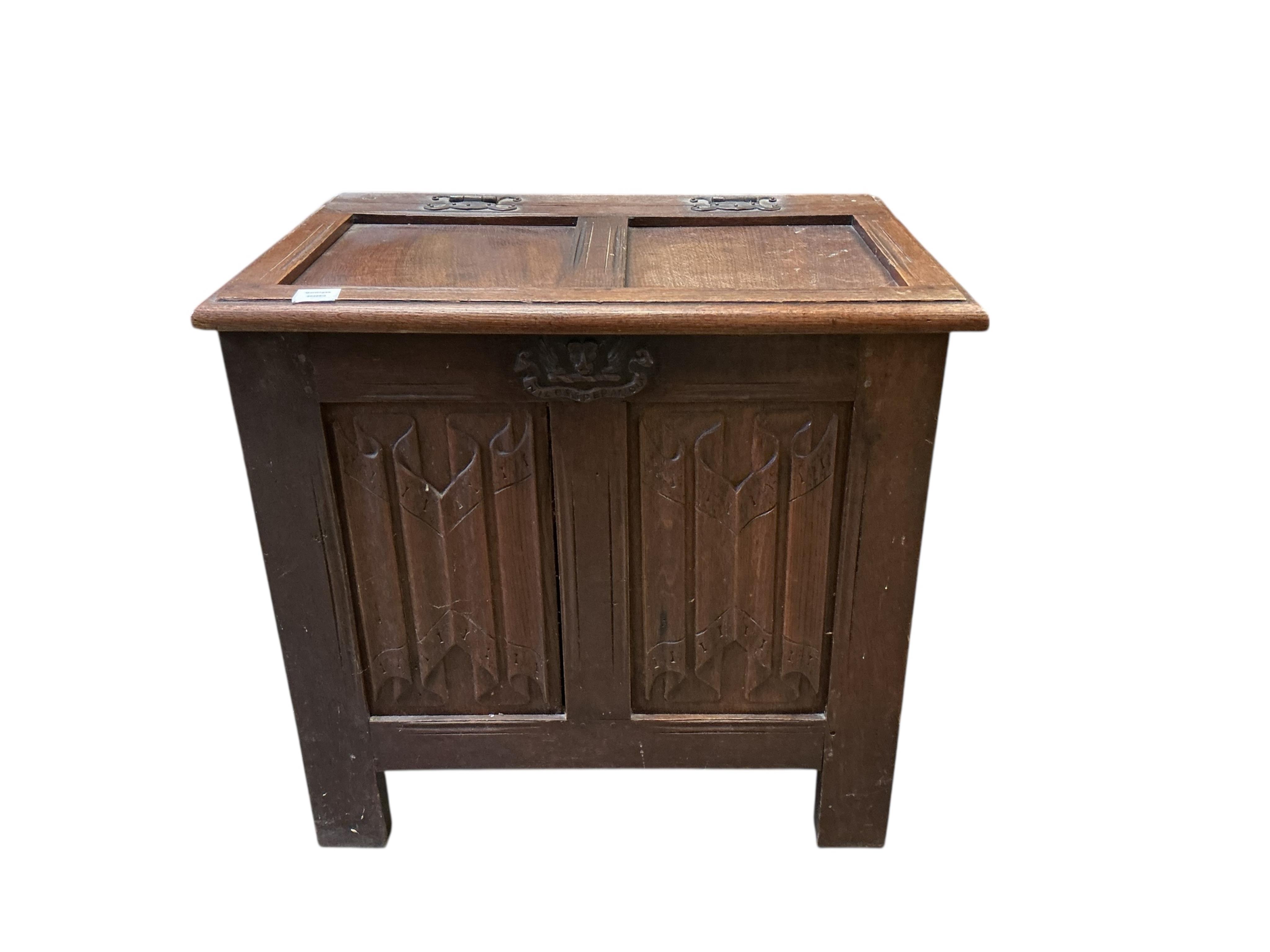Lot 1079 , A small 17th century style linen fold carved oak coffer, width 76cm, depth 51cm, height 72cm