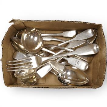 Lot 841 , A small collection of George III and later assorted fiddle pattern flatware, various dates and makers, 19.2oz.