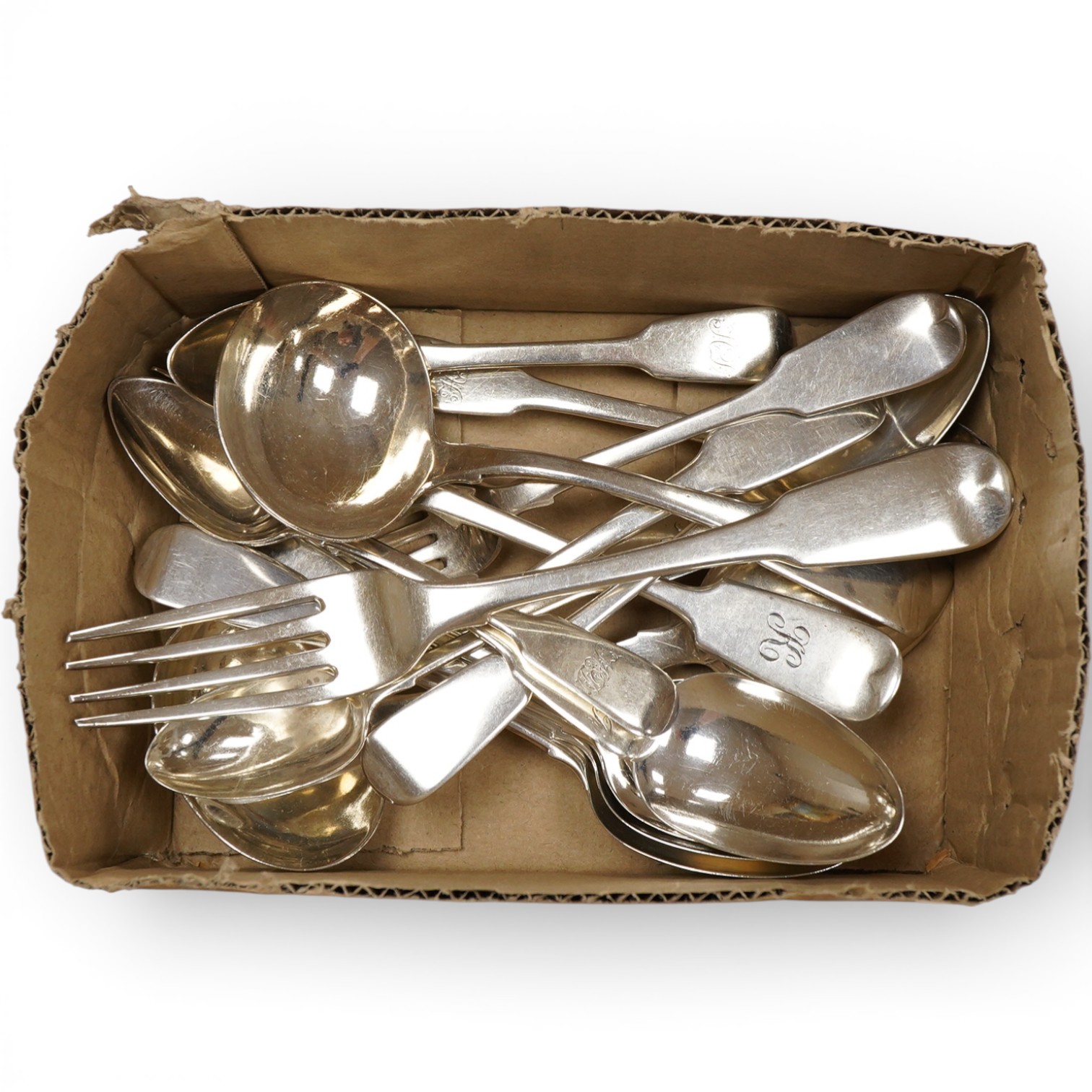 A small collection of George III and later assorted fiddle pattern flatware, various dates and makers, 19.2oz.