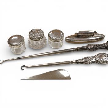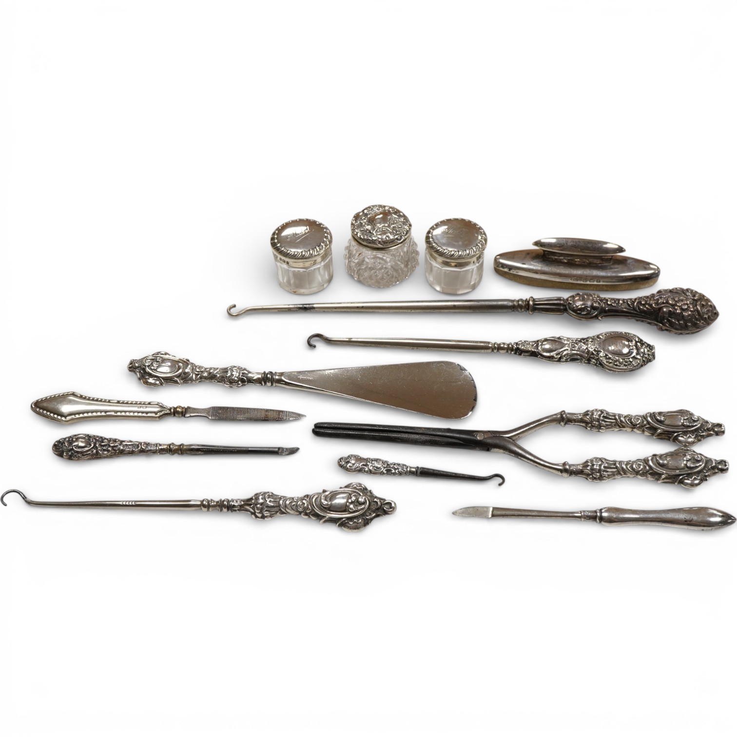 Lot 826 , A small collection of assorted silver handled nail implements and other items including glove stretchers, shoe horn and button hook, together with two silver mounted cut glass toilet jars.