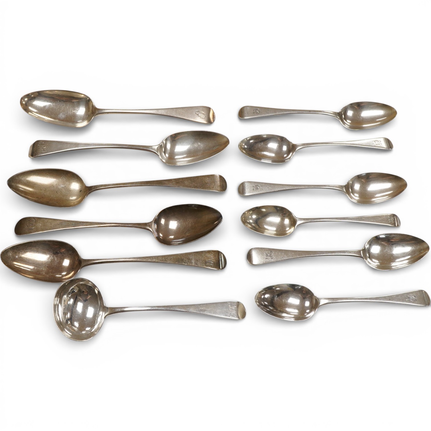 Lot 835 , A small group of George III and later silver Old English pattern flatware, comprising five table spoons, six dessert spoons and a sauce ladle, various dates and makers, 17.6oz.