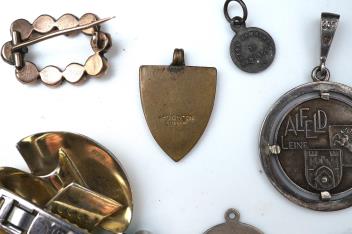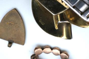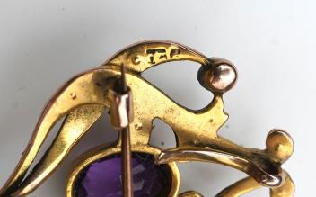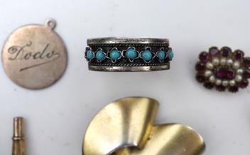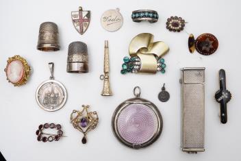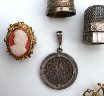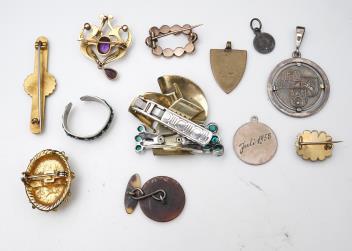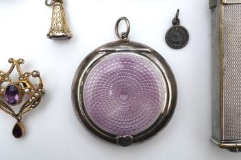 Lot 1927 , A small group of assorted collectables and jewellery including a Dunhill lighter, 64mm, a George V silver and enamel small compact, silver thimble, two Victorian garnet set brooches, an Edwardian 9ct, amethyst and seed p
