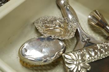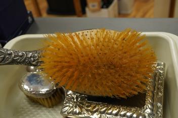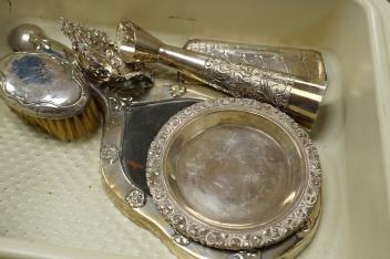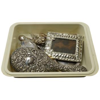 Lot 2858 , A small group of silver and white metal items, including an Edwardian silver and tortoiseshell mounted hand mirror by Samuel Jacob, 26.1cm, a silver mounted hair brush, a small silver mounted brush, a repousse silver pin