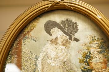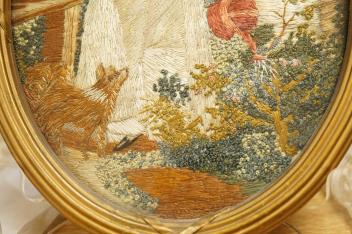 Lot 260 , A small oval gilt framed late 19th century silk polychrome embroidery of a lady watering her garden with her dog at her side, 19cm high. Condition - good.