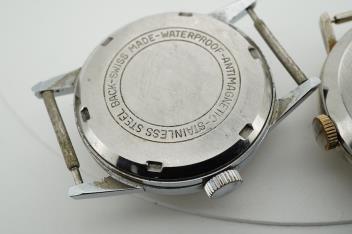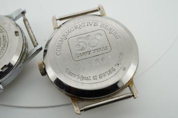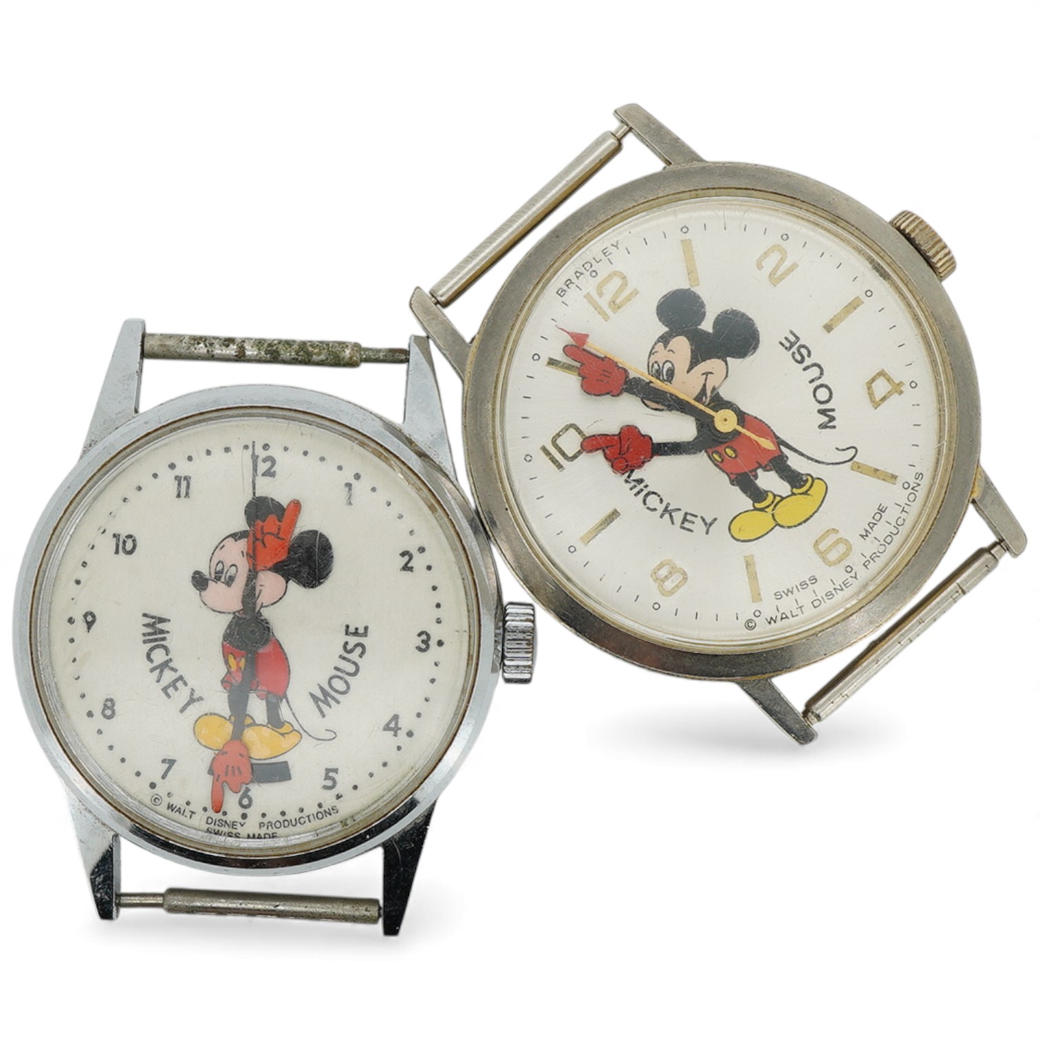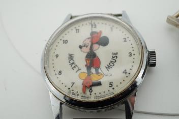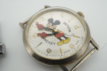 Lot 917 , A stainless steel Walt Disney Productions Swiss made Mickey Mouse manual wind wrist watch, case diameter 30mm, no strap, together with a similar base metal commemorative series Mickey Mouse 50 Happy Years manual wind wri