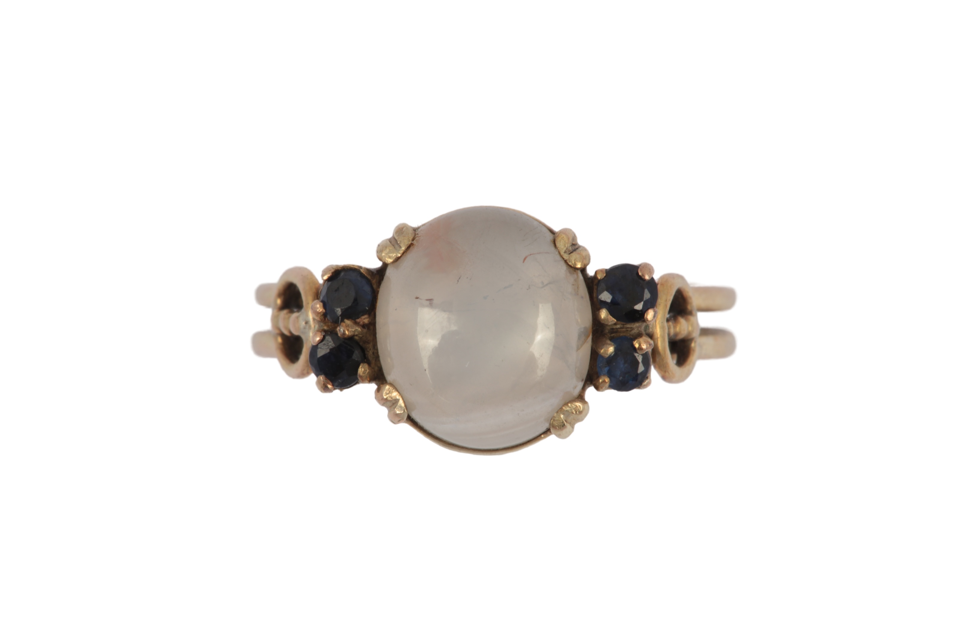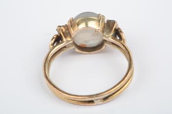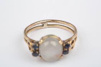 In good condition, sapphire very pale, nearly colourless, star visible under spotlight, measuring approximately 8.9 x 7.6 x 6.3mm. Overall in good condition some minor surface wear to metal.