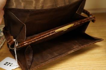 Lot 271 , A stylish 1930's ladies 9ct gold mounted brown crocodile handbag, fitted with small wallet and mirror, 21.5cm wide x 15cm high. Condition - the corners to base, top and handle have wear, the silk lining has a small split