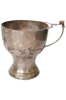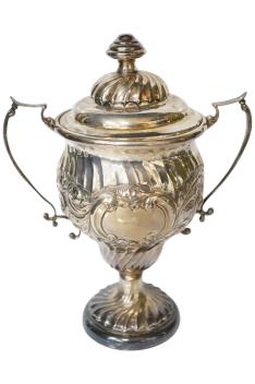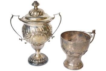 Lot 3864 , A stylish George V silver single handled cup, with card cut decoration, James Wood & Sons, Birmingham, 1912, height 95mm, together with a later silver two handled cup and cover, 11.6oz.