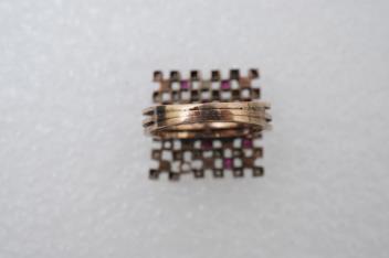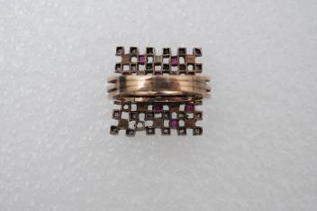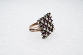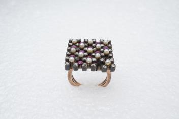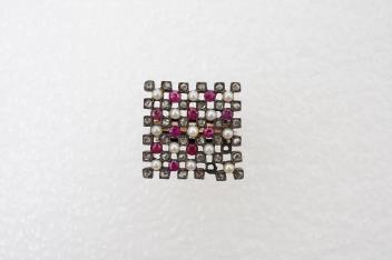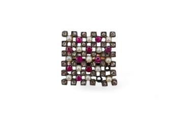 A synthetic ruby, seed pearl and diamond ring, of chequerboard design, designed as a square of circular-cut synthetic rubies, seed pearls and rose-cut diamonds, mounted in silver and gold, size L1/2, two synthetic rubies deficient, seed pearls untested