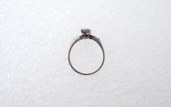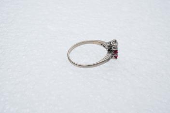 Diamond approximately SI2/I1 clarity, bright and lively, older circular cut. Synthetic ruby with minor wear. Band with evidence of solder, some associated dark discoloration. Overall a pretty design in wearable condition.