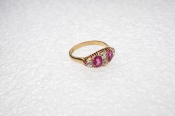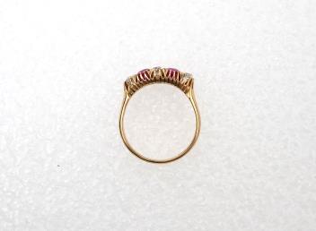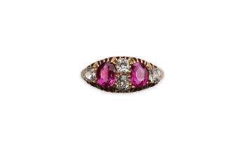 A synthetic ruby and diamond ring, early 20th century, set with two oval synthetic rubies, spaced by cushion-shaped diamonds totalling approximately 0.50 carats, mounted in gold, size Q1/2, stamped 18CT, maker's mark, gross weight approximately 5 grams