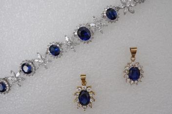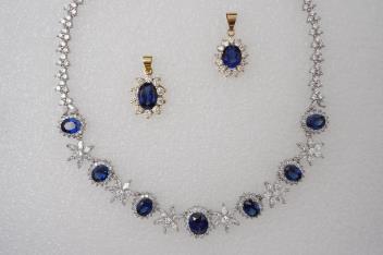Lot 2985 , A synthetic sapphire and cubic zirconia necklace and two pendants, the necklace set with oval synthetic sapphires and brilliant-cut and marquise-shaped cubic zirconias, mounted in silver, length 44cm, stamped 925; togeth