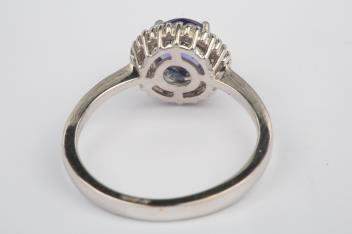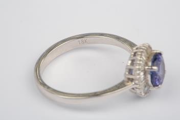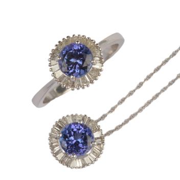 A tanzanite and diamond demi-parure, comprising: a pendant and ring, each set with a circular-cut tanzanite weighing approximately 1.00 carat, within a border of tapered baguette diamonds totalling approximately 0.40 carats, mounted in 18ct white gold, ring size N1/2, pendant length 0.9cm, chain length 44cm, each mounted in 18ct white gold, British hallmarks, combined gross weight approximately 6 grams