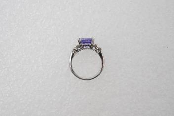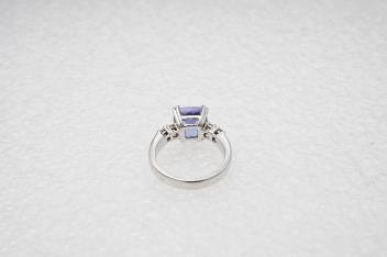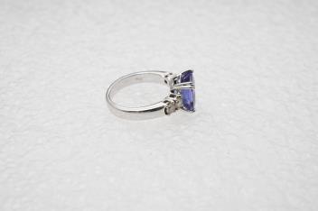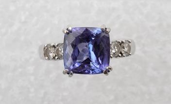 A tanzanite and diamond ring, claw-set with a cushion-shaped tanzanite weighing approximately 2.30 carats, to shoulders set with brilliant-cut diamonds totalling approximately 0.30 carats, mounted in white gold, size J, gross weight approximately 5 grams