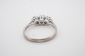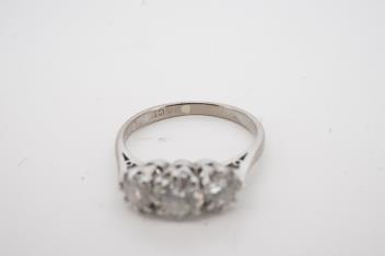 Lot 1139 , A three-stone diamond ring, mid 20th century, set with three brilliant-cut diamonds totalling approximately 1.60 carats, mounted in white gold and platinum, size L1/2, stamped 18ct PLAT, numbered 2787, gross weight appro