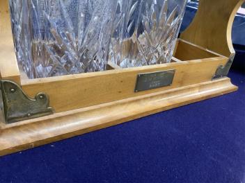 Walnut Tantalus faded but structurally good; silver plating worn, revealing nickel; one plated mount with silver wedding inscription, 1983; working lock mechanism with one key; not Betjeman. Two decanters with internal liquid stains; other decanter and all stoppers good; ; by Royal Brierley, etched marks to undersides.
