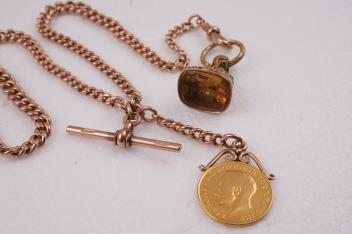 A watch chain, sovereign and fob pendant, late 19th/early 20th century, the watch chain composed of graduated curb linking in 9ct gold, each end with a spring gate clasp, the centre suspending a George V 1914 sovereign coin pendant from a T bar, chain length 46cm, British hallmarks, combined gross weight approximately 58.7 grams including sovereign pendant; together with a gilt metal fob seal with floral engraving, set with a cushion-shaped citrine bearing initials in Gothic script, height 4cm including split ring