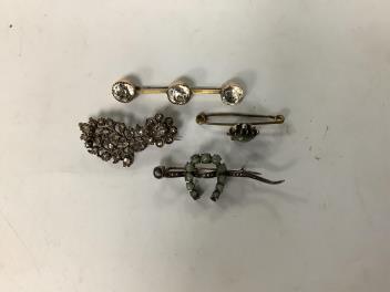 Lot 928 , A white metal and rose-cut diamond cluster set floral brooch, 42mm, a cat's eye quartz and rose cut diamond set bar brooch, one other cat's eye quartz set horseshoe brooch and a three stone white paste set bar brooch.