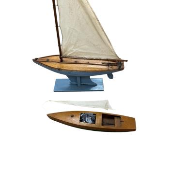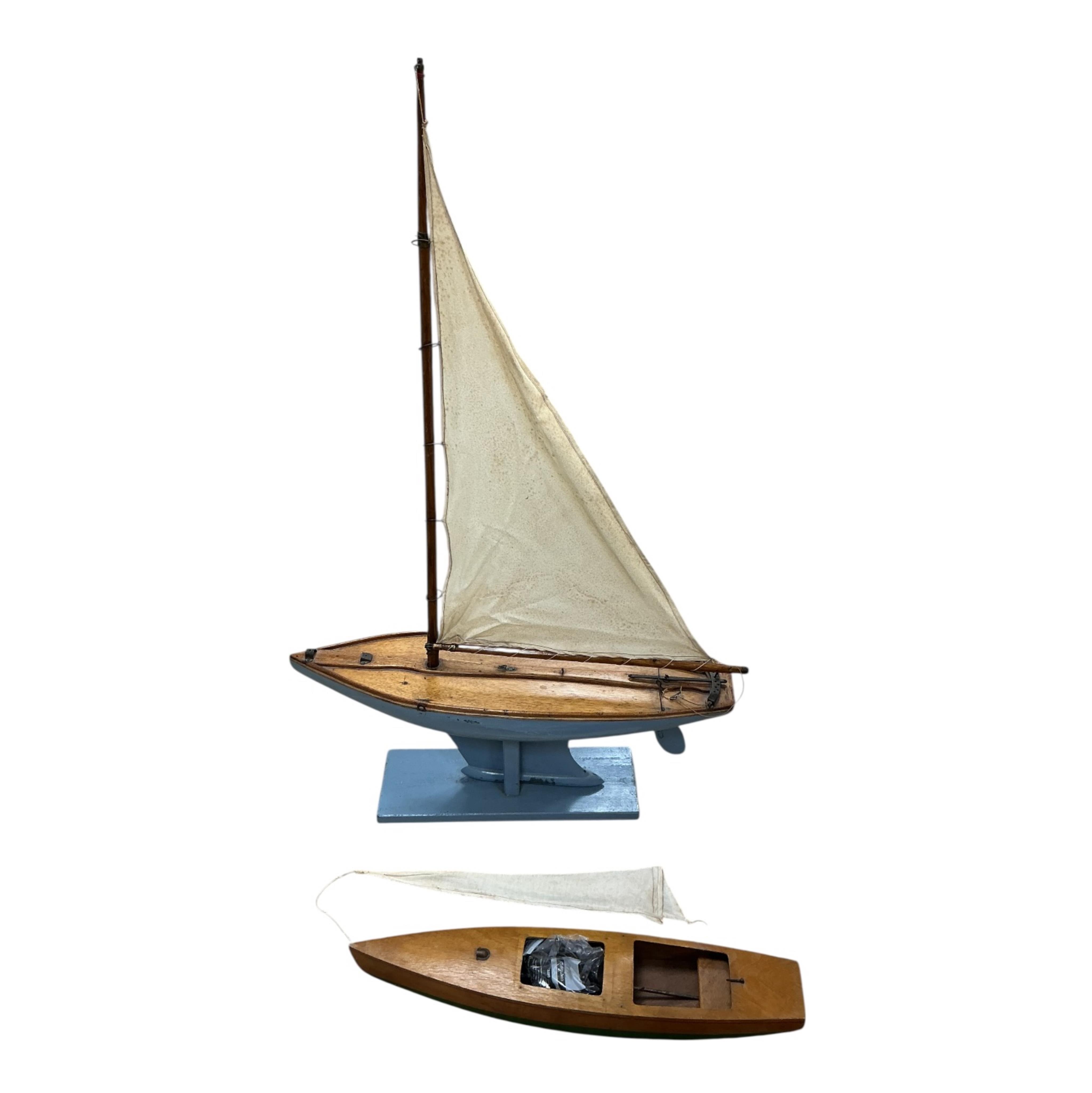 A wooden hull pond yacht - 70cm in length, together with a wooden speedboat with clockwork motor