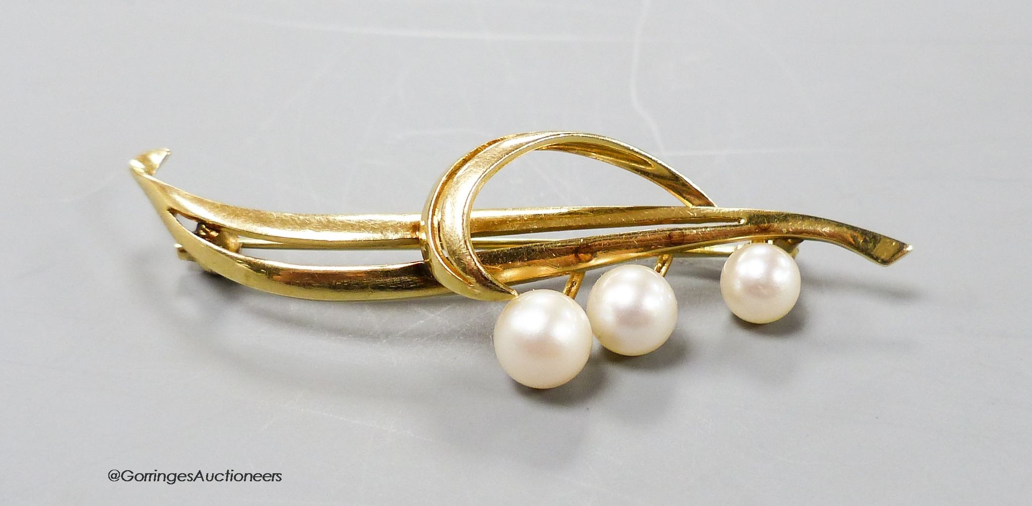 A yellow metal (stamped 14k) and three stone cultured pearl set spray brooch, 55mm, gross 5.2 grams.