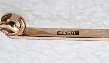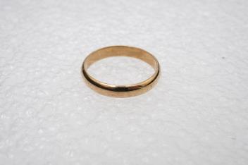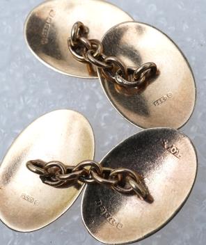 Lot 905 , A yellow metal wedding band, a pair of 9ct gold plain oval cufflinks and a 9ct bar brooch, gross weight 11 grams.