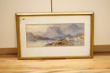 Aaron Edwin Penley R.A. (1807-1870), Mountainous riverscape with figure, signed, watercolour, 18 x 46cm