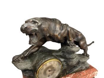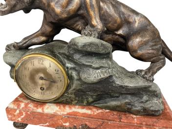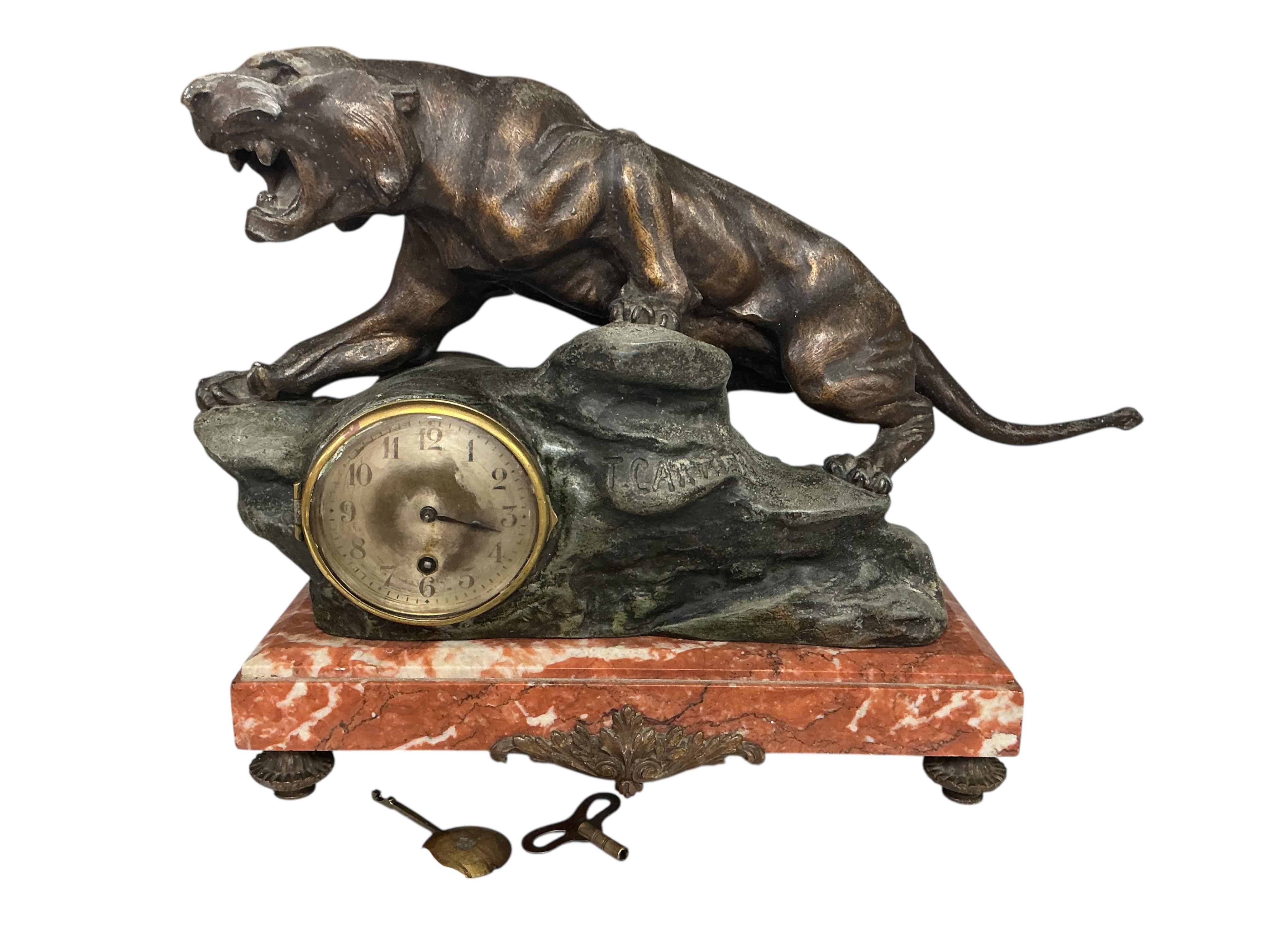 Lot 1407 , After Cartier, an Art Deco style spelter and rouge marble panther mantel clock, height 30cm.