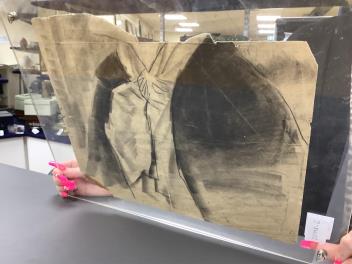 Paper torn from a larger sheet, as shown; some stains, edges frayed. No further information gleaned from reverse aspect, showing remaining part of a torso.
