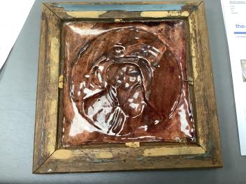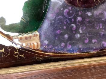 An apparent scratch around sitter’s head, upper-left quadrant, believed to be a firing characteristic; otherwise enamels bright; no damage seen other than that caused by the a frame pin at one reverse corner. The white areas left and right are light reflections.
