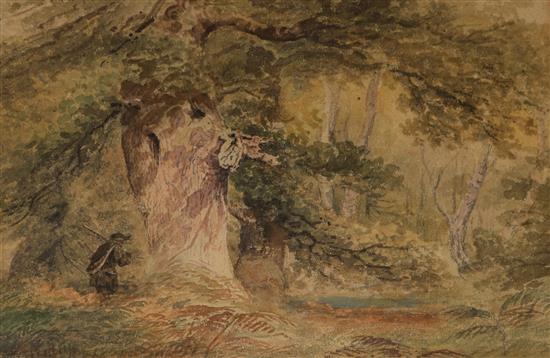 Lot 1331 , Alfred de Breanski, watercolour, Boatman on a lake, a seascape by Hector McKinley and a woodland scene, largest 24 x 35cm
