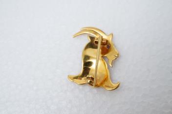 An 18ct gold livery brooch and a gold panel bracelet, comprising: a brooch designed as a heraldic goat's head, from the coat of arms of the Worshipful Company of Cordwainers, its eye set with a circular-cut sapphire, mounted in 18ct gold, length 2.6cm, British hallmarks circa 1990, gross weight approximately 5 grams; and a 9ct gold panel brooch with floral engravings, length 16cm, British hallmarks, gross weight approximately 9 grams, spare link