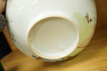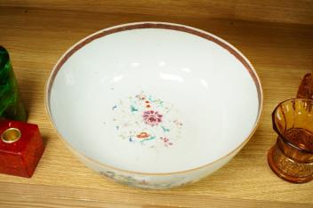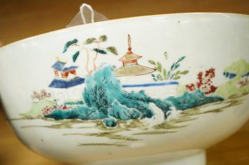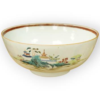 Lot 402 , An 18th century Chinese export famille rose punch bowl, decorated with birds, flowers and pagodas, 31cm in diameter