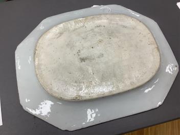 Splinter chip to the lower rim, another smaller splinter chip to one top left corner. Several shallow losses to edges.