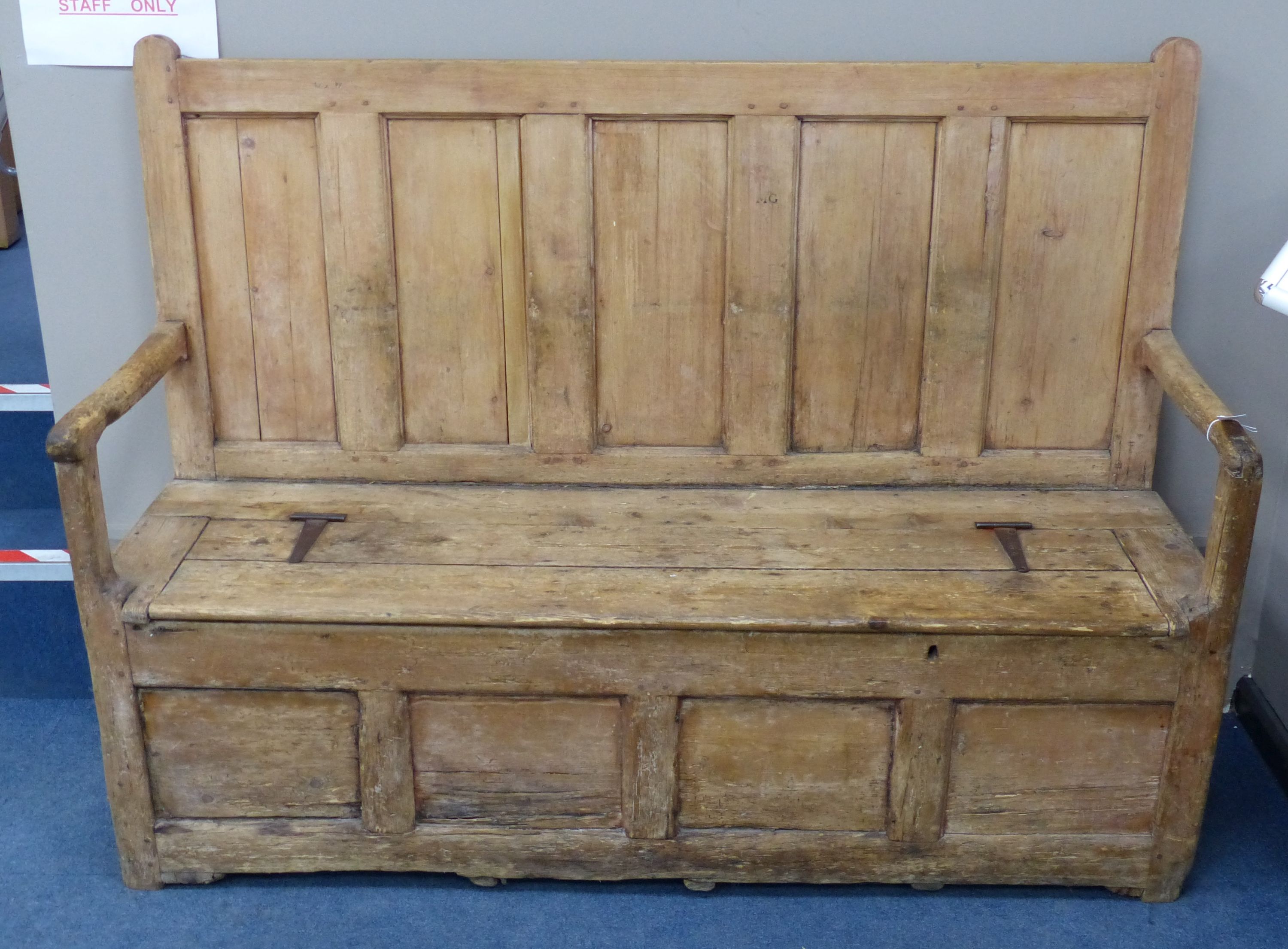 Lot 1218 , An 18th century pine settle, length 157cm, depth 51cm, height 116cm