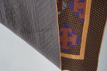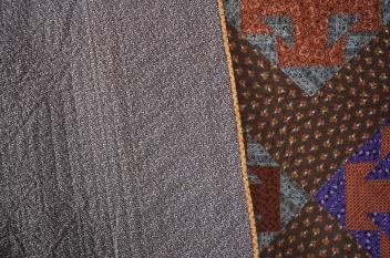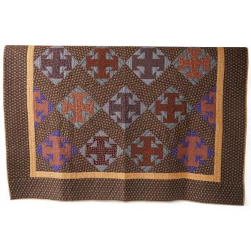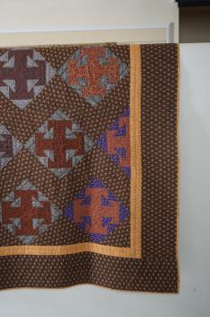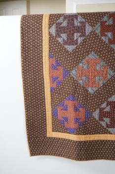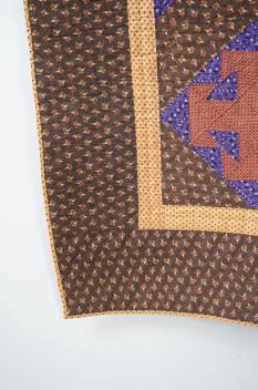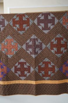 An American Virginian quilt, 1860-1870 (circa American Civil War). Known as a ‘T’ block Virginian style pattern, with a hand pieced and hand quilted front trunk, sold as an unused or washed quilt, designed in brown, red, ochre, purple and grey cotton printed floral designs. Backed with a single cotton fabric printed with a tiny floral design and a narrow ochre border. 210cm x 208cm.