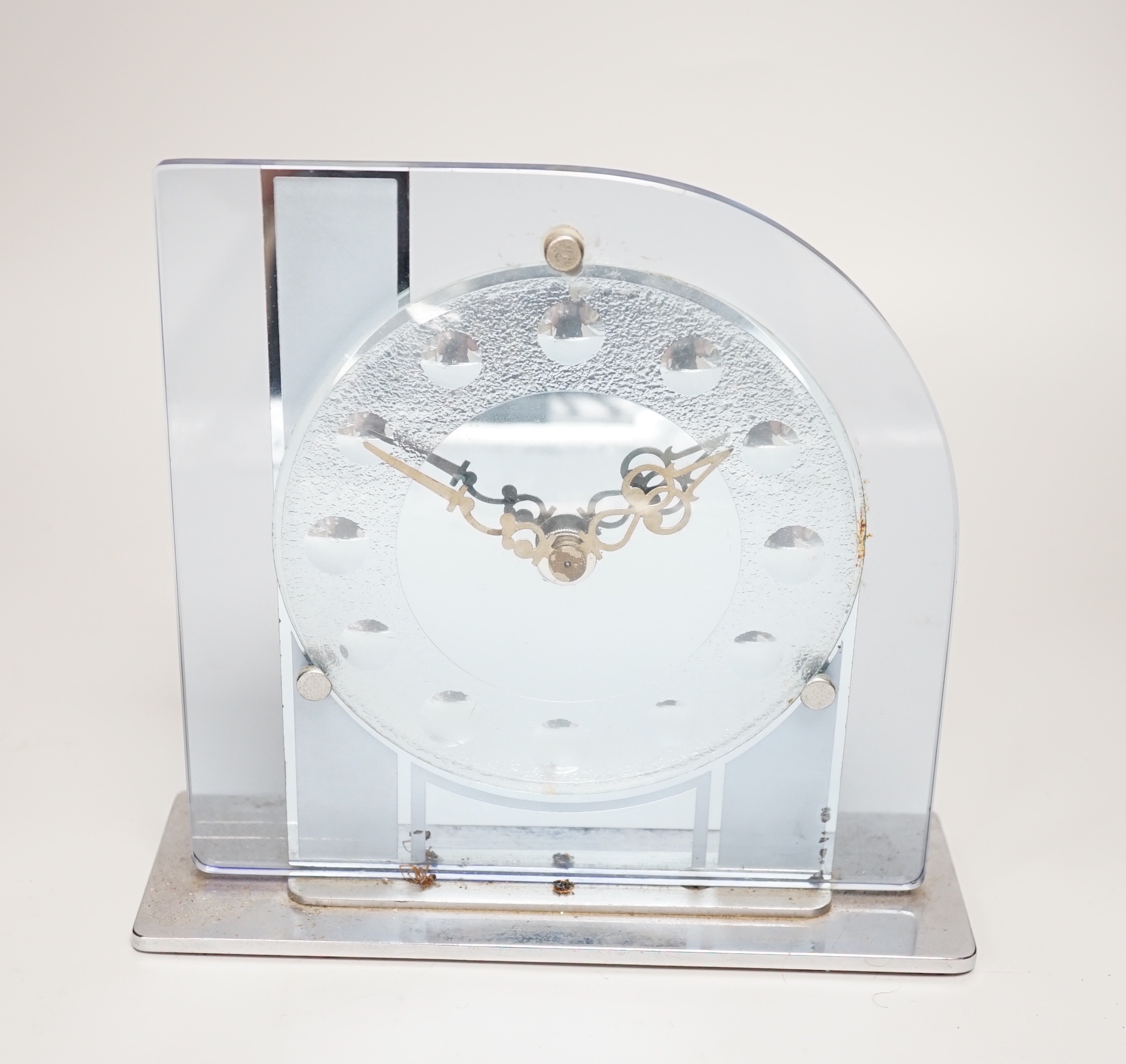 An Art Deco chrome and decorative glass mantel clock, 21cm high