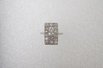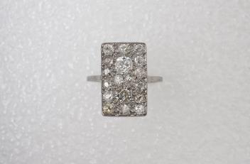 Well-made and in good condition, diamonds bright and lively, mixed colour and clarity grades. Plaque measuring approximately 18.5 x 11.5mm. Setting beautifully made. Shank likely resized. Gross weight approximately 5.5 grams.