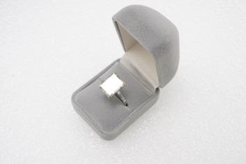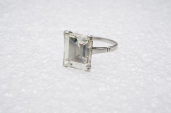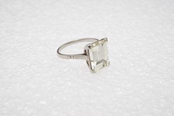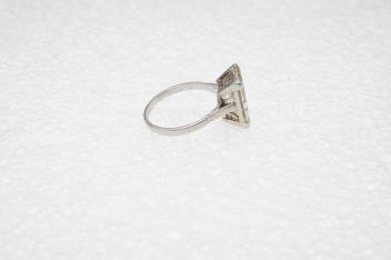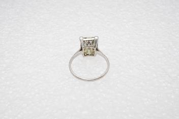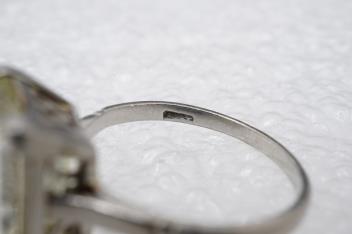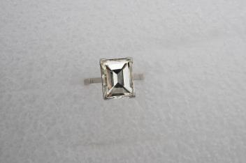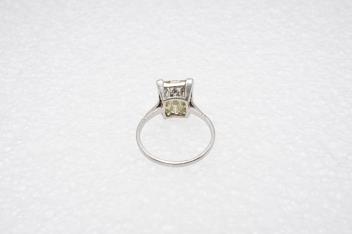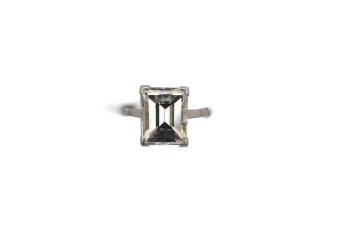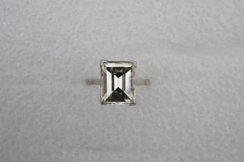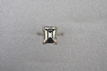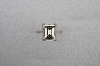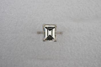 An unusually austere and pared down step-cut with relatively few facets - a large table and very large pavilion facets giving dramatic flashes of light and excellent rainbows in sunlight. Draws a bit of colour, estimated colour M+ (S-T stated in EDR report), estimated clarity VS2 (small cloud of crystals towards girdle, not obvious, tiny chip to one crown facet, again barely visible, VS stated in EDR report), faint to medium blue fluorescence. Stated measurements in report are accurate, but using standard formulae the weight is calculated at approximately 6.50 carats (6.38-7.20) rather than 7.50 as stated in report. Mount in good condition.