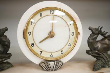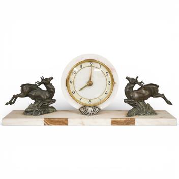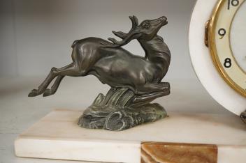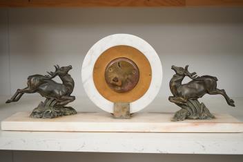 Lot 1452 , An Art Deco marble mounted mantel clock on marble base with two decorative spelter stag mounts either side, 46.5 cm wide.