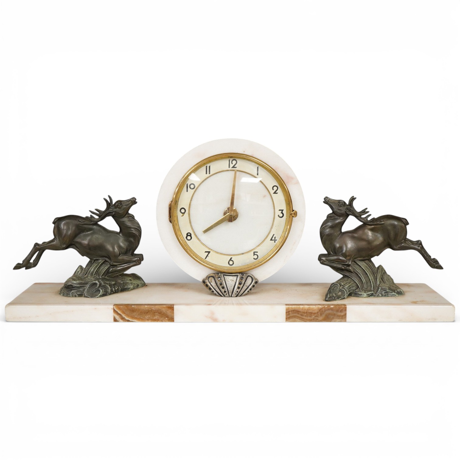 An Art Deco marble mounted mantel clock on marble base with two decorative spelter stag mounts either side, 46.5 cm wide.