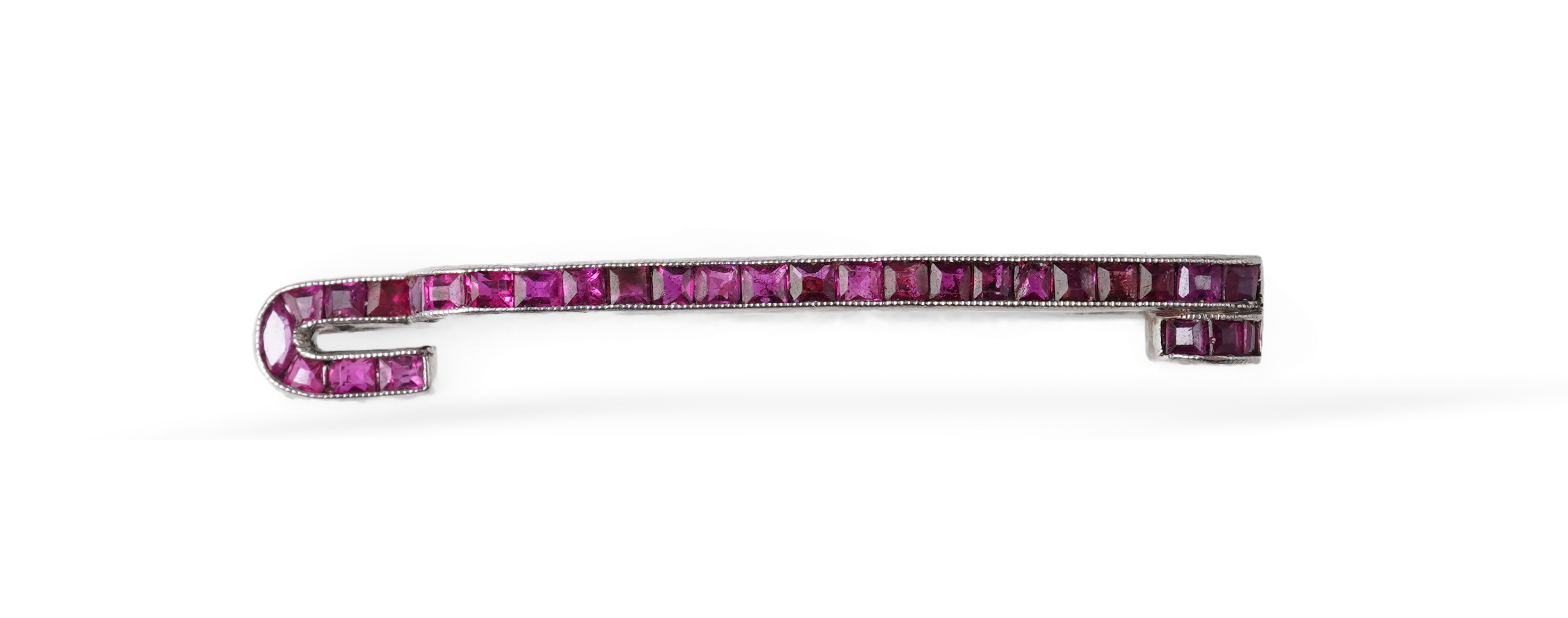 An Art Deco ruby brooch, Austria, 1920s, designed as an arched bar brooch with one scroll and one hooked end, set with calibré-cut rubies in millegrained borders, mounted in platinum, length 4.5cm, Austrian assay marks, stamped 950